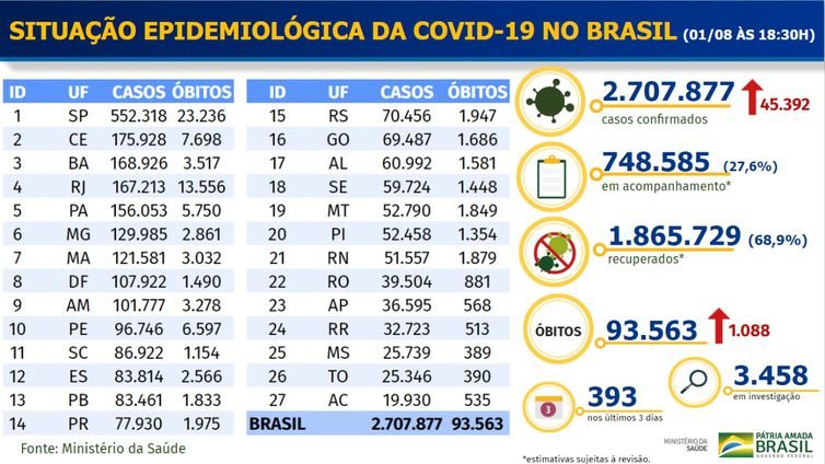 Brasil tem 2,7 milhões de casos e 93,6 mil mortes por covid-19