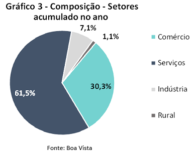 Mantida a base de comparação, o Comércio apresentou leve aumento na participação, avançando para 30,3% (+0,4 p.p.). No sentido contrário, a Indústria caiu para 7,1% (-0,7 p.p.).