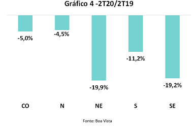 Na comparação com o trimestre encerrado em junho de 2019, no 2T20 todas as regiões do país registraram queda nas aberturas de empresas. As regiões Nordeste (-19,9%) e Sudeste (-19,2%) foram as que mais recuaram no período, como pode ser visto no gráfico 4.
