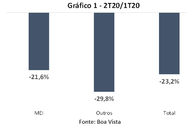 O número de novas empresas caiu 23,2% no 2º trimestre em relação aos três primeiros meses de 2020, segundo levantamento da Boa Vista com abrangência nacional. Na comparação com o 2º trimestre do ano passado, a queda foi de 16%. Já no resultado acumulado em quatro trimestres o indicador passou de 16,5% em março para 8,1% em junho, menor patamar desde setembro de 2017, quando atingiu 7%.