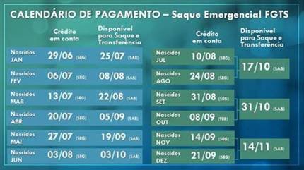 O crédito e o saque em espécie do Saque Emergencial do FGTS ocorrem de forma escalonada, conforme o calendário a seguir: