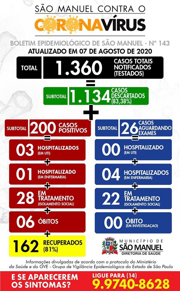 A Cidade de São Manuel chegou nesta sexta-feira, 7 de agosto, aos 200 casos confirmados de covid-19 desde o início da pandemia. Número foi confirmado pela secretaria de saúde do município.