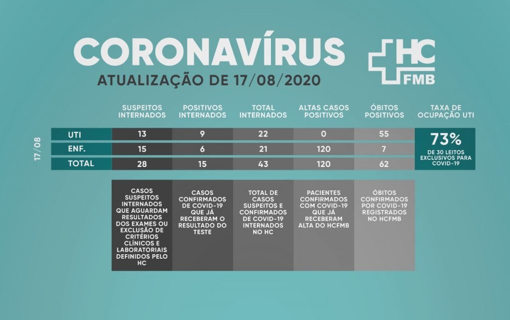 O número refere-se desde o início da pandemia e a pessoas de uma região composta por 2 milhões de habitantes. Conforme o HCFMB, há neste momento 43 pacientes internados, sendo que quinze são positivas ao novo coronavírus e 28 com sintomas de síndrome gripal e que ainda aguardam a confirmação de testes.