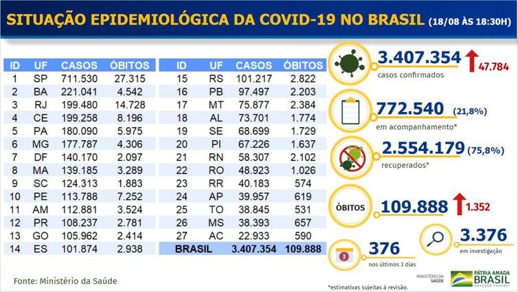 A atualização diária do Ministério da Saúde divulgada hoje (18) apontou o Brasil com 3.407.354 casos confirmados desde o início da pandemia do novo coronavírus. Entre ontem (17) e hoje, foram notificadas pelas secretarias de saúde dos estados e municípios mais 47.784 pessoas diagnosticadas com covid-19.