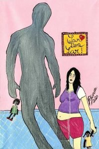 A obra “Fantasma do Lar”, da artista visual Ge Guevara, traz uma interpretação que nos ajuda a pensar diversos aspectos da questão. O ingênuo tom rosa das paredes e a placa “Lar Doce Lar” pendurada não escondem a sombreada figura assustadora que se levanta sobre a vítima, cujo pranto interno e externo de dor escorre pela blusa e pela alma.