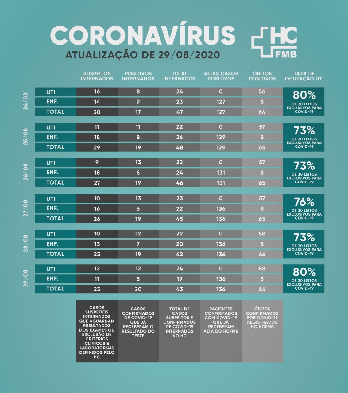A ocupação de leitos de terapia intensiva (UTI) exclusivos para covid-19 no Hospital das Clínicas de Botucatu chegou a 80% neste sábado, 29 de agosto. Segundo a unidade, estão em uso 24 das 30 vagas disponíveis.
