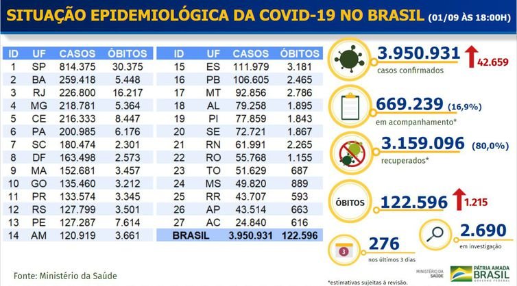 Ainda de acordo com o boletim do Ministério da Saúde, 669.239 pessoas estão em acompanhamento e outras 3.159.096 já se recuperaram.