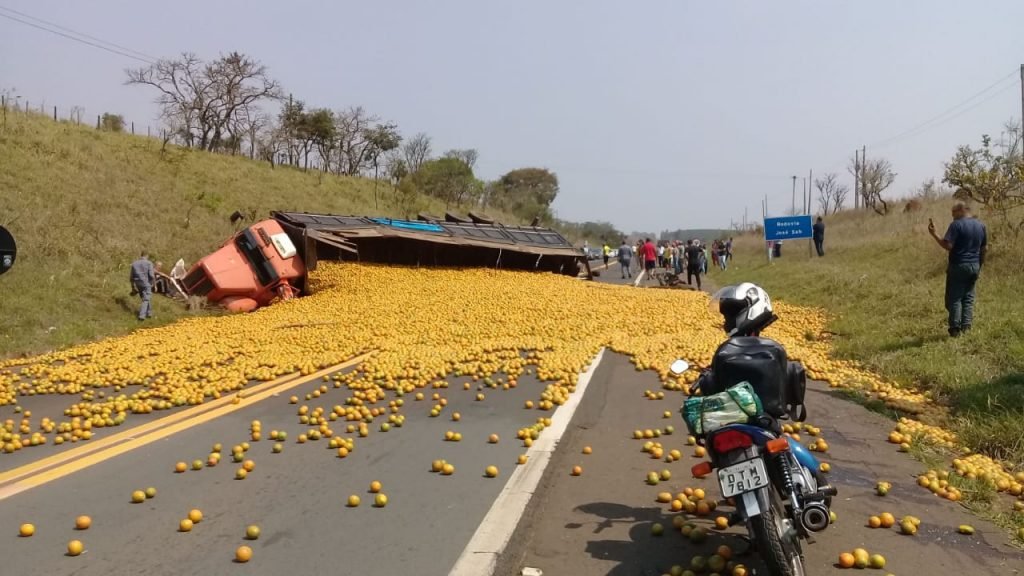 Um caminhão carregado com laranjas tombou na tarde deste sábado, 12 de setembro, na rodovia vicinal José Sab, que conecta Itatinga a Botucatu e também à Rodovia Castello Branco (SP-280).