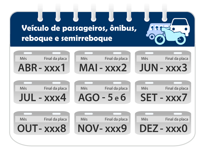 Também está disponível para consulta o calendário de licenciamento para veículos de passageiros, ônibus, reboque e semirreboque. O pagamento para qualquer final de placa pode ser feito a partir de abril e até o último dia útil do mês referente ao número final da placa.