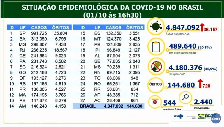 O boletim diário do Ministério da Saúde, divulgado nesta quinta-feira (1), revela que o Brasil registrou 4.847.092 casos confirmados do novo coronavírus desde o início da pandemia.