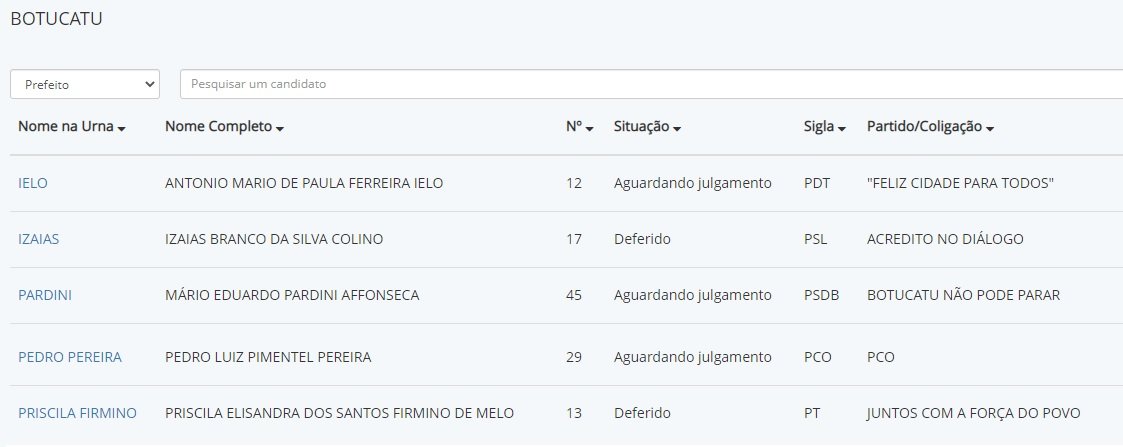 A Justiça Eleitoral divulgou no Portal do Tribunal Superior Eleitoral (TSE) o deferimento de apenas duas candidaturas a Prefeitura de Botucatu até o momento. O deferimento de Izaias (PSL), da coligação ‘Acredito no Diálogo’, e da petista Priscila Firmino, da coligação “Juntos com a Força do Povo”, foi publicado na manhã desta quinta-feira, 8.