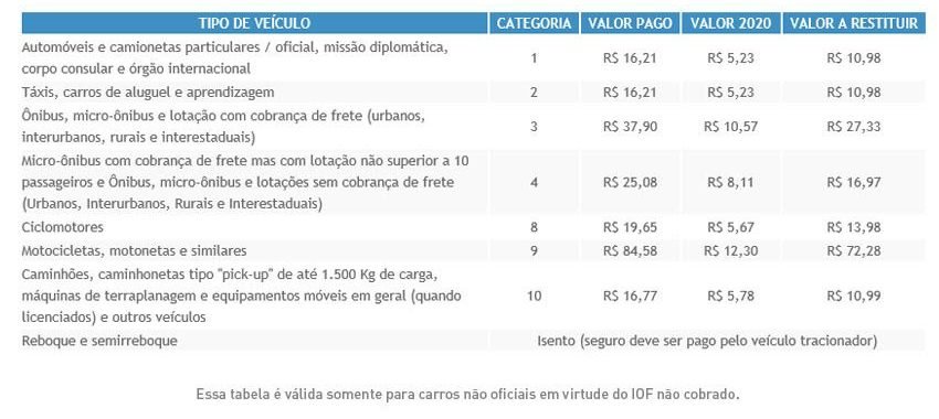O valor do Seguro DPVAT é definido por tipos de veículos e, por isso, os proprietários que pagaram neste ano com os valores referentes a 2019 têm direito a restituição com valores distintos. Conheça abaixo os reembolsados em cada uma das categorias.