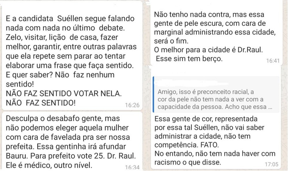 Em uma delas, o autor diz: “Bauru não merecia ter essa prefeita de cor com cara de favelada comandando nossa cidade. A senzala estará no poder nos próximos quatro anos”.