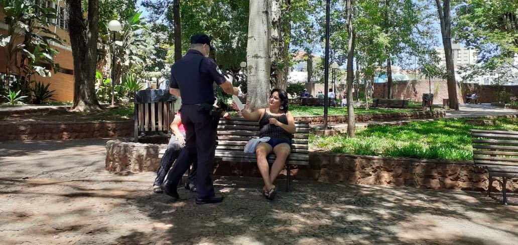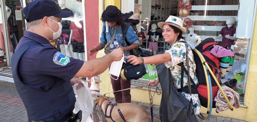 Para evitar a proliferação do novo Coronavírus, uma guarnição da GCM percorre a Amando de Barros orientando pessoas sobre o uso correto das máscaras e distribuindo equipamentos para quem não está usando.