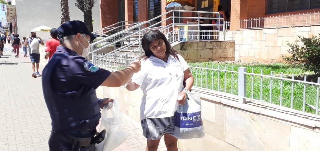 A Guarda Civil Municipal está intensificando a entrega de máscaras e as orientações de uso a pedestre que circulam pela Rua Amando de Barros, principal corredor comercial de Botucatu. Neste período de final de ano, aumenta a circulação de pessoas que procuram as lojas para as compras de Natal e que as agencias bancárias para saque de salários e benefícios.