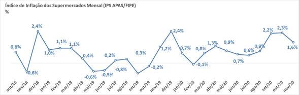 O Índice de Preços dos Supermercados (IPS), calculado pela APAS/FIPE e divulgado mensalmente pela Associação Paulista de Supermercados (APAS), aponta uma inflação de 1,58% no setor em novembro. O número é 0,71 pontos percentuais (p.p) menor que outubro.