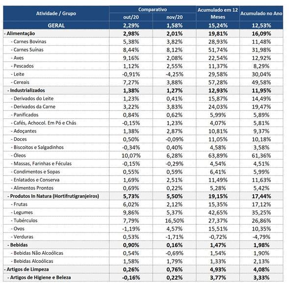Um dos principais itens que puxou a inflação geral em novembro para cima são as proteínas. A explicação é que o aumento se deve ao crescimento dos custos de produção devido à elevação da ração dos animais, ao aumento da demanda por suíno e à demanda internacional de importação. No geral, os cortes bovinos subiram 3,8% e as aves 2%, frente 5,3% e 9,1% registrados em outubro, respectivamente. Os suínos praticamente se mantiveram em 8%.