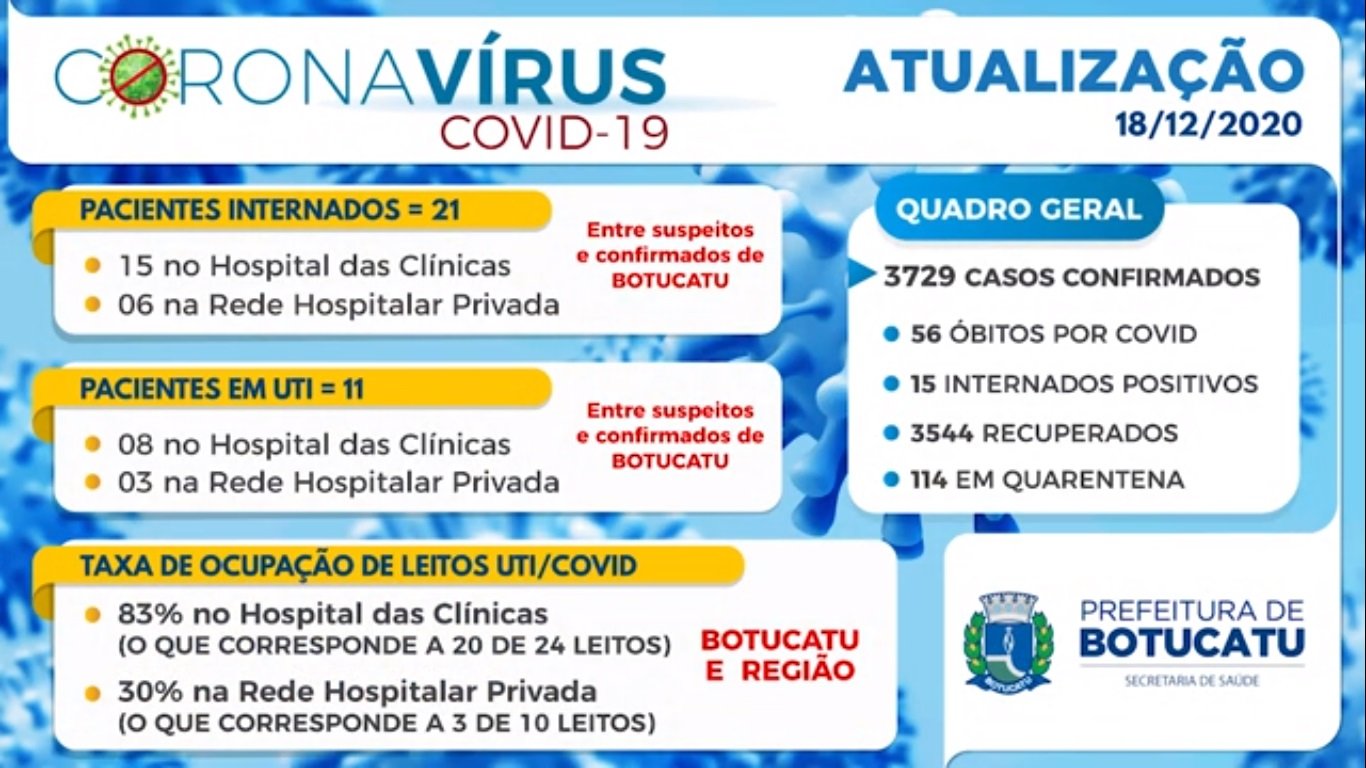 Na sexta-feira, 18 de dezembro, Botucatu registrou 3729 casos confirmados de covid-19 desde o início da pandemia. Segundo boletim emitido pela Secretaria Municipal de Saúde, houve o incremento de 52 botucatuenses nas estatísticas oficiais, já que o total acumulado nas 24 horas anteriores era de 3677.
