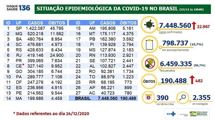 Os casos de pessoas infectadas no Brasil pelo novo coronavírus ao longo da pandemia aproximam-se da marca de 7,5 milhões. Nas últimas 24 horas, as autoridades de saúde notificaram 22.967 novos diagnósticos positivos para a covid-19, totalizando 7.488.560. Ontem (24), o painel de informações marcava 7.425.593 casos acumulados.
