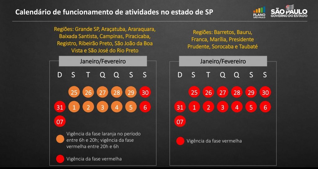 O Estado também determinou que, após as 20h e até as 6h em dias úteis, e integralmente nos finais de semana, todas as dez regiões classificadas na etapa laranja deverão seguir as restrições da vermelha. Nos finais de semana dos dias 30 e 31 de janeiro e 6 e 7 de fevereiro todas as regiões estarão na fase vermelha em tempo integral.