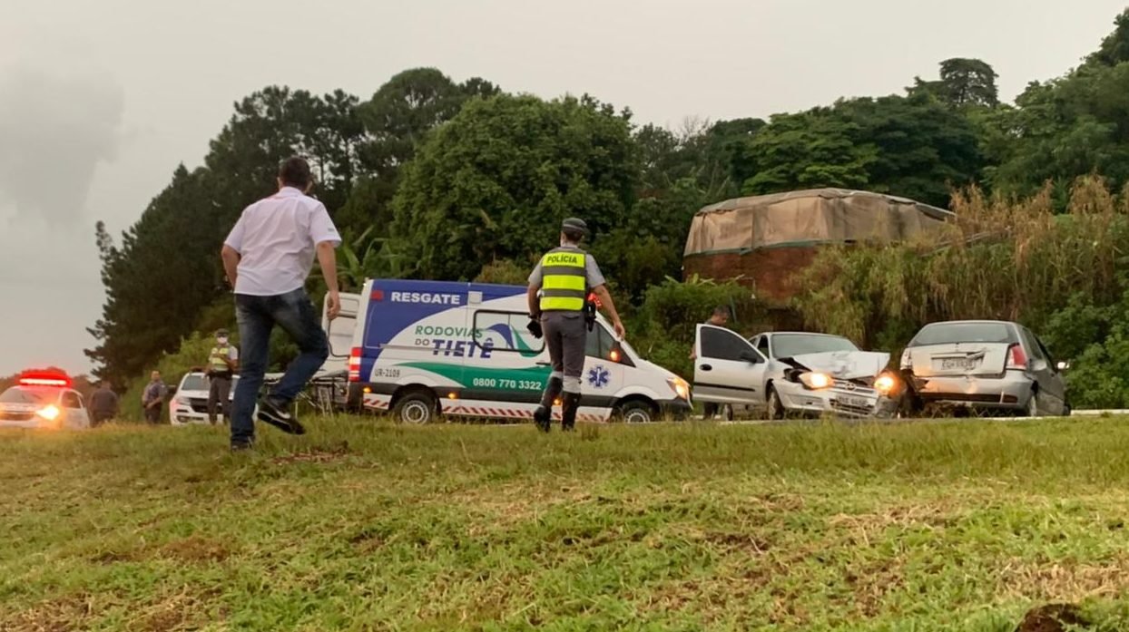 Um Chevrolet Celta e um Fiat Palio se chocaram e colidiram contra a grade de proteção da rodovia, provocando danos consideráveis nos veículos. Segundo informações três pessoas ocupavam os veículos- sendo dois homens e uma mulher- esta última com ferimentos na cabeça. Os demais sofreram escoriações pelos corpos.
