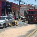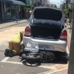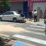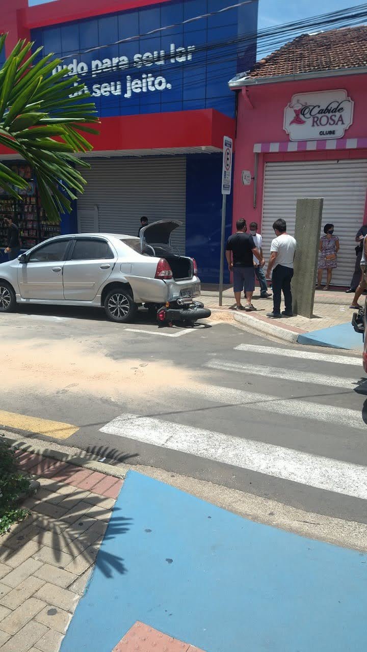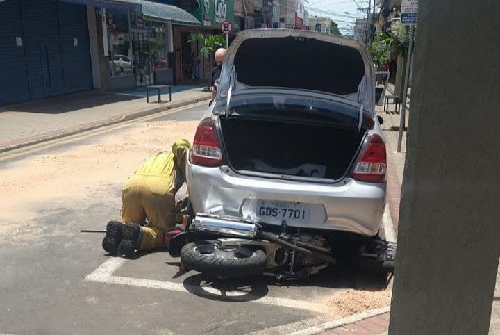 Após colisão, moto vai parar debaixo de carro estacionado na Rua Amando