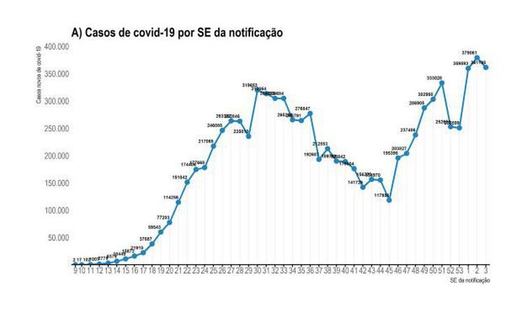 Apesar da oscilação para baixo, a curva de casos da pandemia nessa nova onda se mantém em um patamar maior do que na primeira onda no meio de 2020, quando o pico chegou a 319.653 na semana epidemiológica 30, entre 19 e 25 de julho.