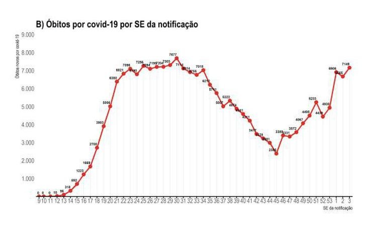 A curva de mortes fez movimento distinto, com oscilação positiva de 7% em relação à semana anterior. Na semana epidemiológica 3 foram informadas pelas autoridades de saúde 7.149 óbitos, contra 6.665 na semana anterior, com as mortes por covid-19 voltando a subir após uma oscilação para baixo na semana epidemiológica 2.
