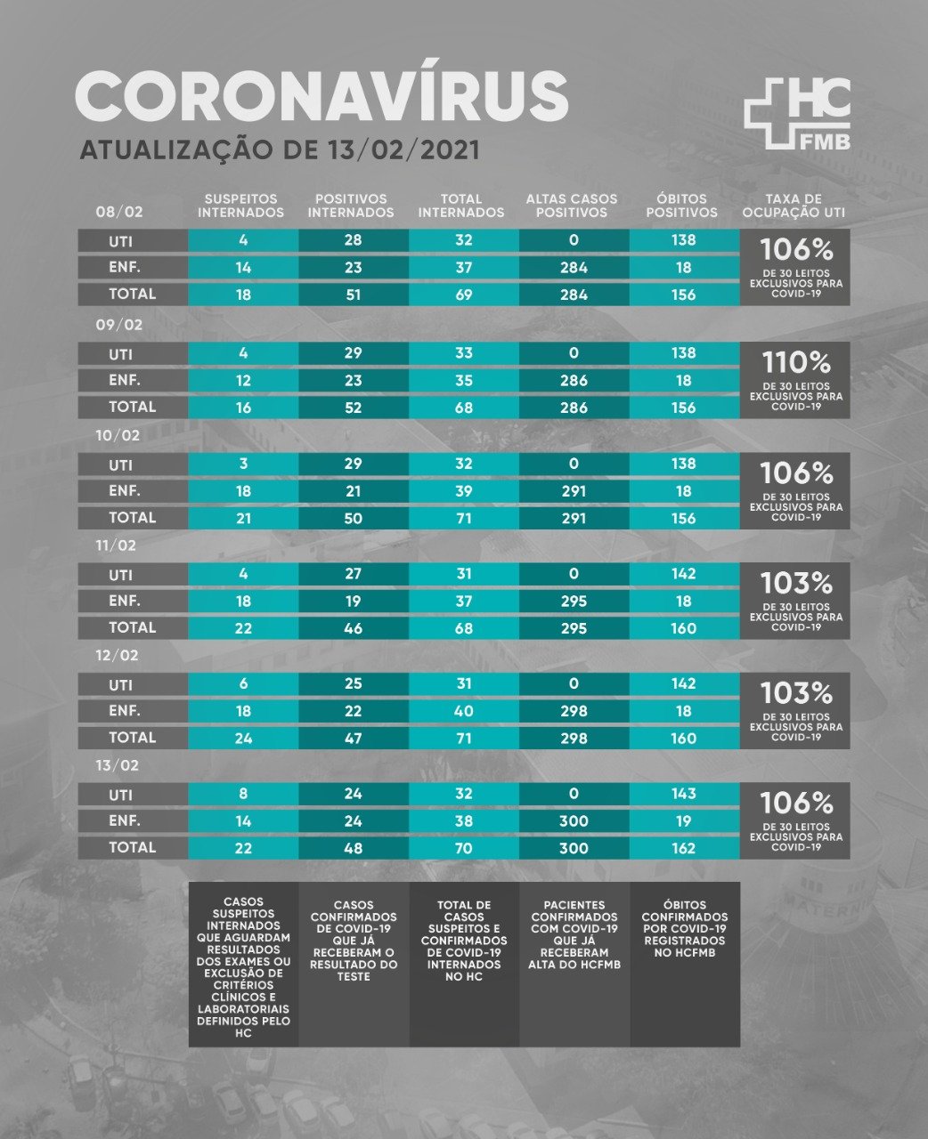 O HCFMB tem atingido diariamente sua ocupação máxima de leitos de UTICOVID. Neste sábado, atingimos 106% de ocupação, o que significa que além dos 30 leitos de UTICOVID disponíveis no HC, mais dois leitos estão ocupados por dois pacientes covid positivo.