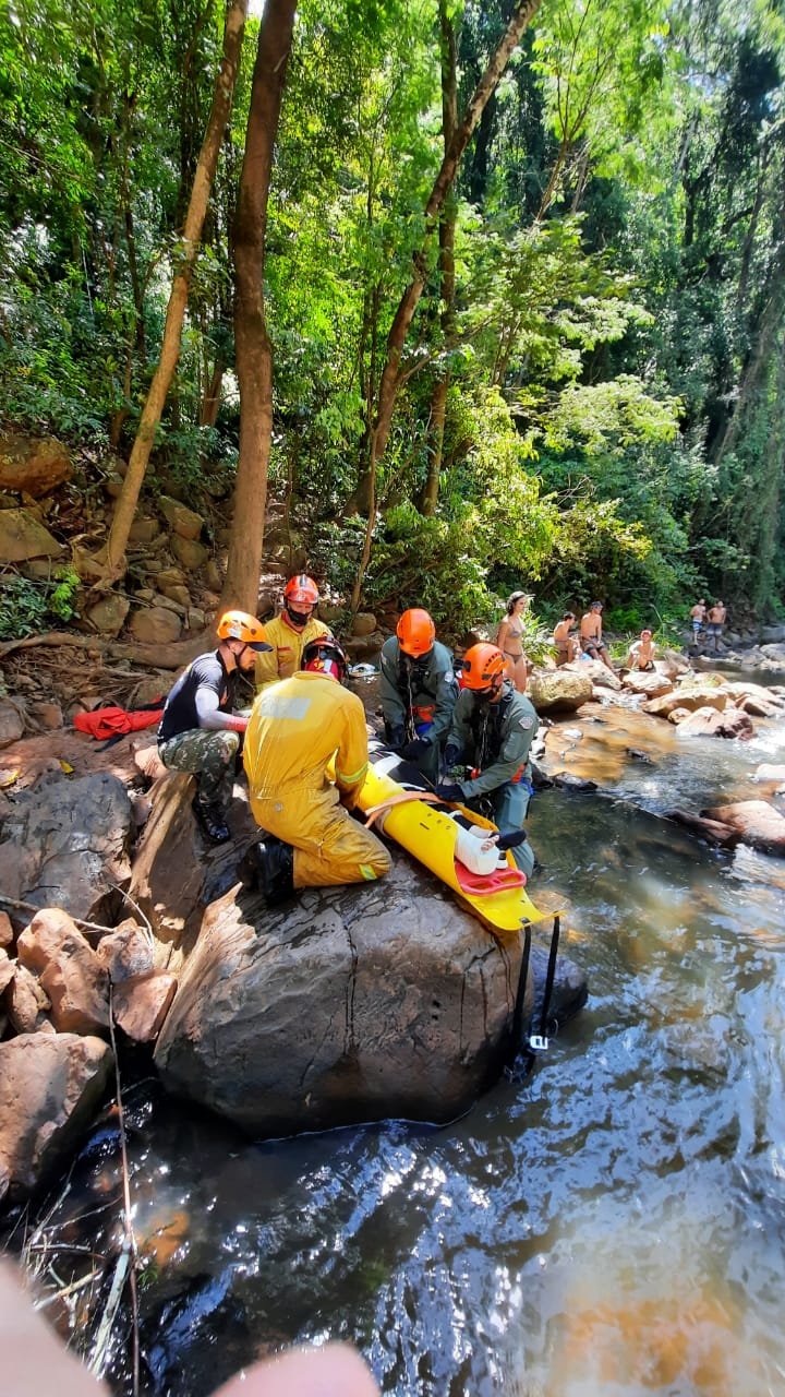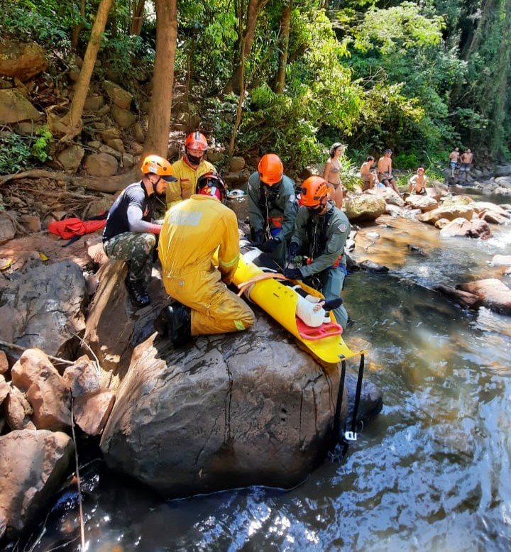 Uma mulher de 61 anos precisou ser resgatada pelo Helicóptero Águia, da Polícia Militar, após sofrer uma torção no tornozelo esquerdo enquanto visitava a cachoeira da Pavuna, em Botucatu.