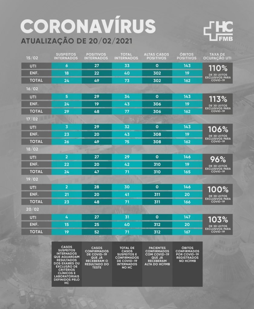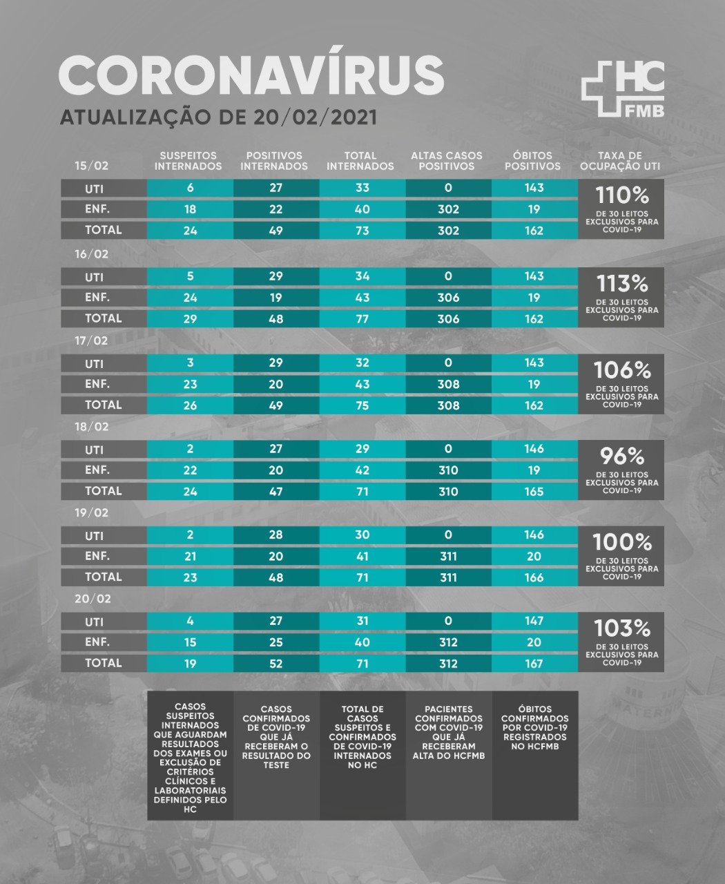 Há 71 pacientes internados vindos de todo o interior paulista, já que o HCFMB é um hospital estadual. Desse total, 52 já têm diagnósticos positivos do novo coronavírus.