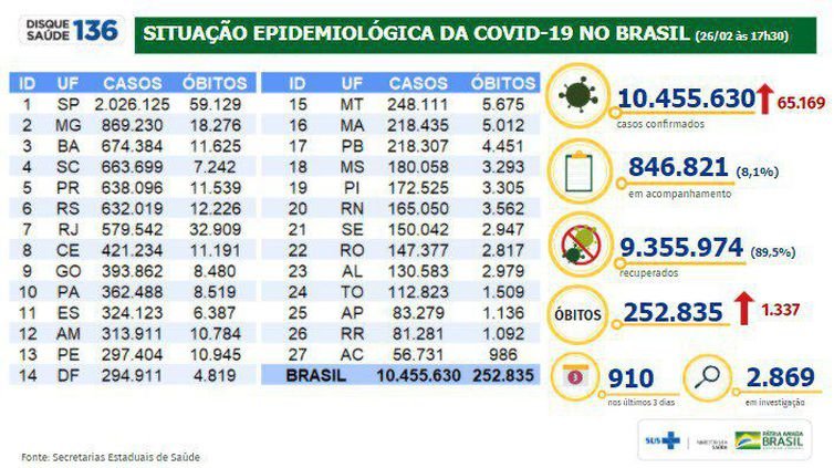 Segundo a última atualização dos números da pandemia de covid-19 no Brasil, 65.169 casos foram confirmados em 24 horas. No total, 10.455.630 pessoas já foram infectadas pela doença no país, que é o terceiro em número de contágios no mundo. Outros 846.821 pacientes seguem em acompanhamento médico.