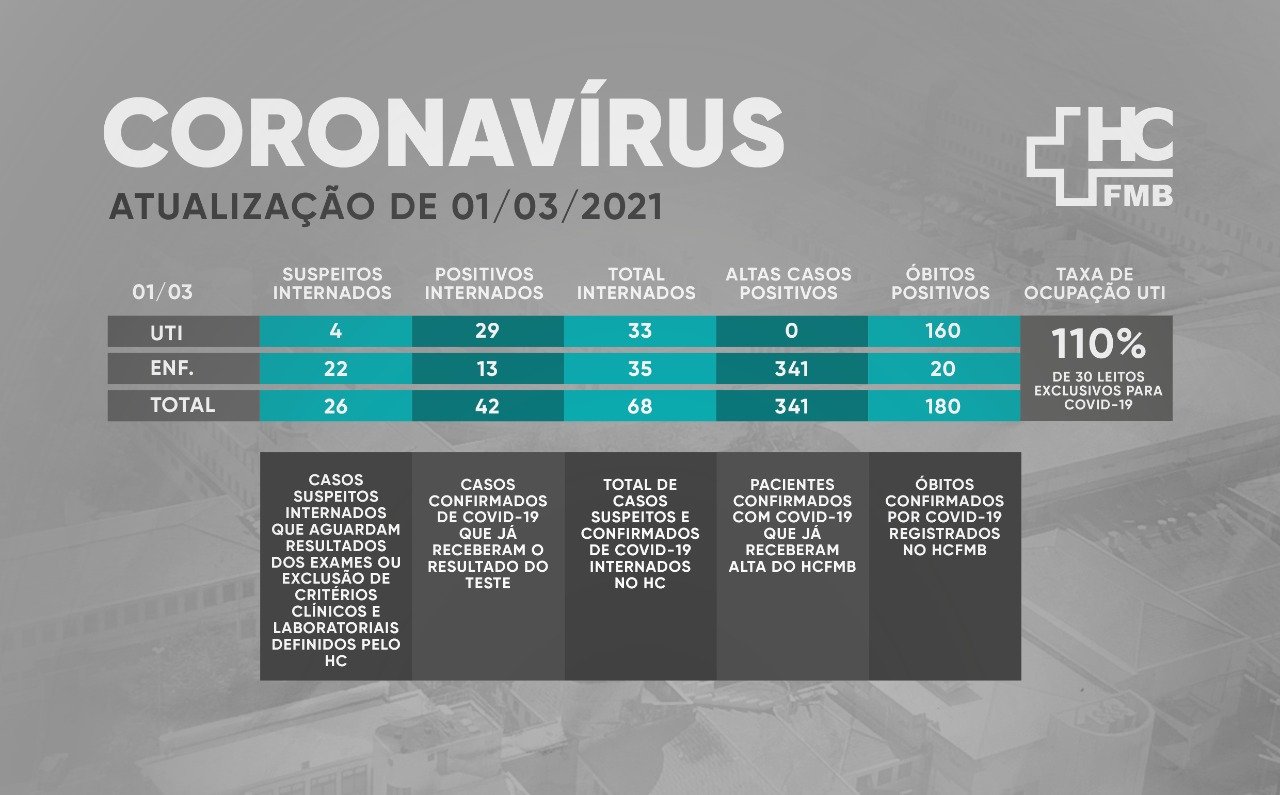 Março começa com o Hospital das Clínicas de Botucatu (HCFMB) tendo 110% de ocupação em leitos de terapia intensiva (UTI) exclusivos para tratamento contra a Covid-19. O número consta no boletim oficial emitido pela unidade, vinculada ao Sistema Único de Saúde (SUS).