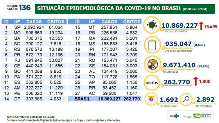 As mortes registradas nesta sexta-feira (5) superaram as de ontem (4), quando o balanço diário sobre a pandemia marcou 1.699 falecimentos. No total, 262.770 pessoas já perderam a vida para a covid-19 desde o início da pandemia.