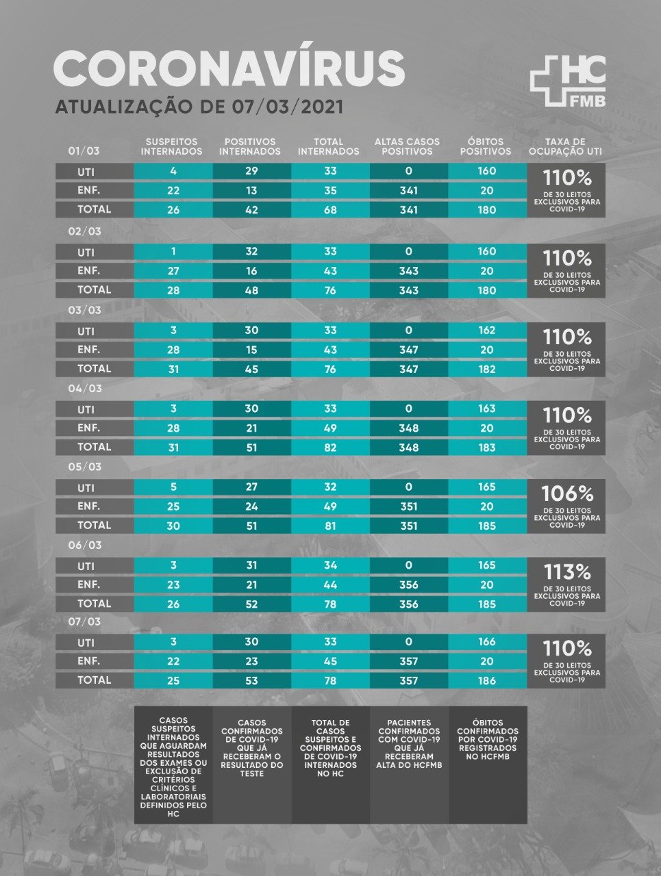 Desde o início da pandemia ocorreram 357 altas hospitalares, com 186 mortes.