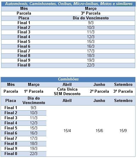 O calendário também segue até o dia 22/3 para os veículos com final de placa 0. As demais parcelas devem ser pagas em data única para todas as placas, em 15 de junho (segunda parcela) e 15 de setembro (última).