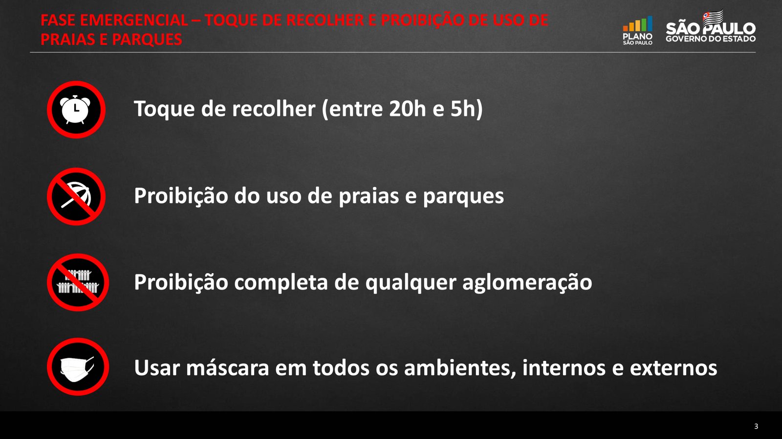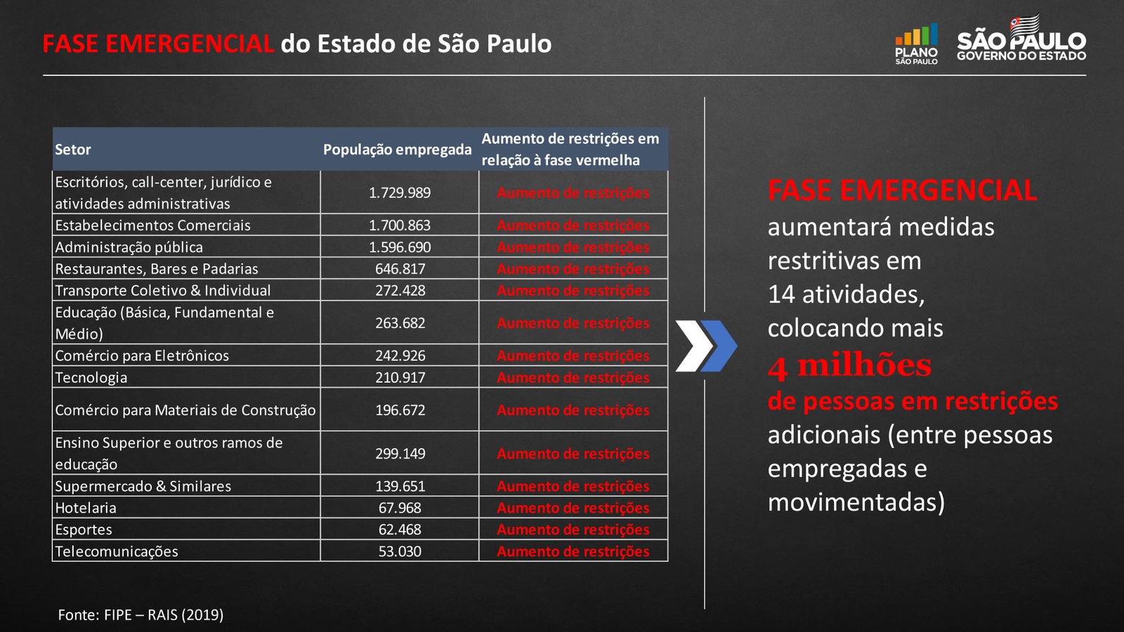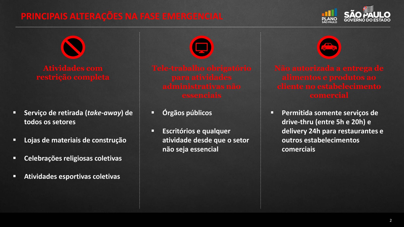 A fase emergencial do Plano São Paulo de enfrentamento à pandemia do novo coronavírus estabelece medidas mais duras de restrição de algumas atividades entre os dias 15 e 30 de março, inclusive parte daquelas classificadas como essenciais. O objetivo é ampliar o distanciamento social e reduzir a circulação urbana. Confira um resumo a seguir:
