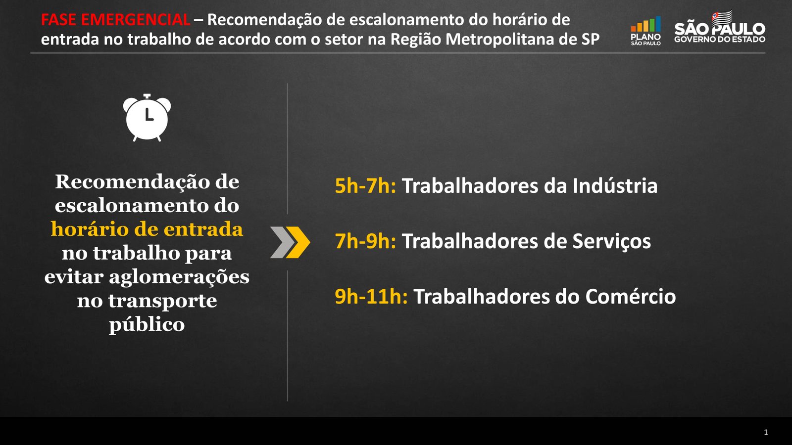 TRANSPORTE COLETIVO – Recomendação de escalonamento de horário para os trabalhadores da indústria, serviços e comércio. Os horários de entrada indicados são das 5h às 7h para profissionais da indústria, 7h às 9h para os de serviços e 9h às 11h para os do comércio.