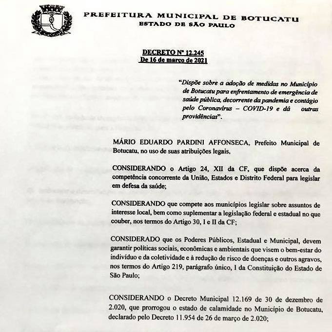 O agravamento da pandemia de covid-19 em Botucatu fez com que o prefeito Mário Pardini (PSDB) editasse no início da noite desta terça-feira, 16 de março, o decreto 12.145 que estabelece lockdown no município durante os dois próximos finais de semana. As medidas mais severas terão início na sexta-feira, 19.