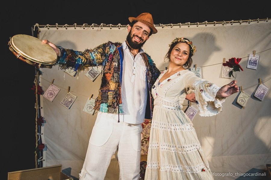 O texto foi especialmente criado em versão de cordel, rimado e com as graças, provocações e encantamentos típicas dessa apaixonante linguagem. As personagens “Janjão Proseador” e “Marieta das Virtudes” chegam cantando e tocando instrumentos pelo meio do público e, ao adentrarem no palco, uma arena delimitada por uma corda de sisal no chão com rosas de plástico, começam a contar uma história apaixonante. Ambos se tornam múltiplos personagens, seja atuando, seja manipulando bonecos. Nesse movimento, contam uma das mais apaixonantes e simbólicas histórias conhecidas mundialmente: a Bela e a Fera.