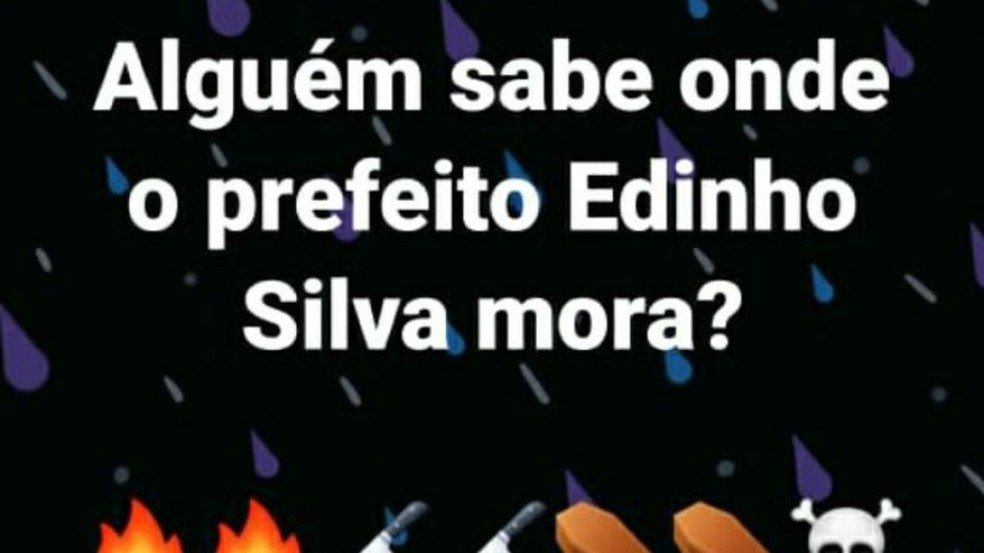 Em uma das publicações, um homem perguntou: “Alguém sabe onde o prefeito Edinho mora?”. A frase foi acompanhada de figuras de fogo, caixões, facas e caveira.