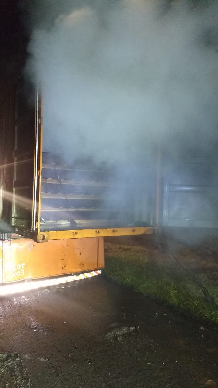 O eixo e as rodas estavam em chamas, sendo que as chamas passou para o interior de um contêiner que era transportado. Em seu interior havia placas de madeira. Foi necessário o uso de uma máquina retroescavadeira para a remoção do contêiner após a extinção das chamas. Não houve feridos.