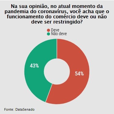 As limitações ao comércio têm apoio de 54% da população. Nesse grupo, as opiniões também se dividem: 51% defendem o fechamento parcial, durante apenas algumas horas do dia, e 47% apoiam o fechamento total do comércio durante o dia todo.