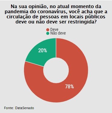 Três em cada quatro brasileiros concordam que a circulação de pessoas em locais públicos deve ser restringida no atual momento da pandemia de covid-19. É o que indica pesquisa do Instituto DataSenado que avaliou a opinião das pessoas sobre as medidas impostas pelos estados e municípios para conter a disseminação do coronavírus.
