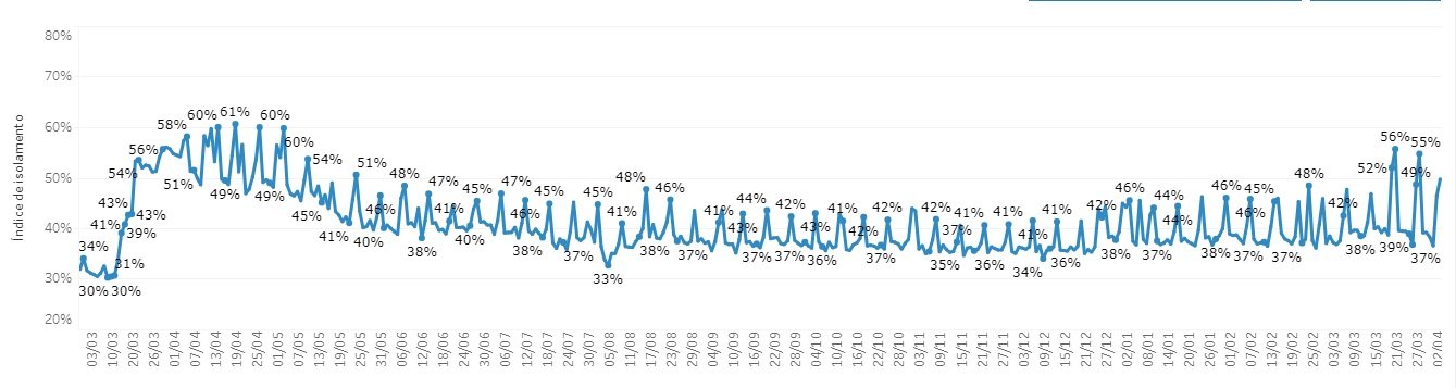 Nos demais finais de semana que tiveram lockdown, as médias registradas foram de 50%. Especificamente nos dois últimos sábados com medidas restritivas severas, os índices registrados foram de 49% no dia 27 de março e de 52% em 20 de março.