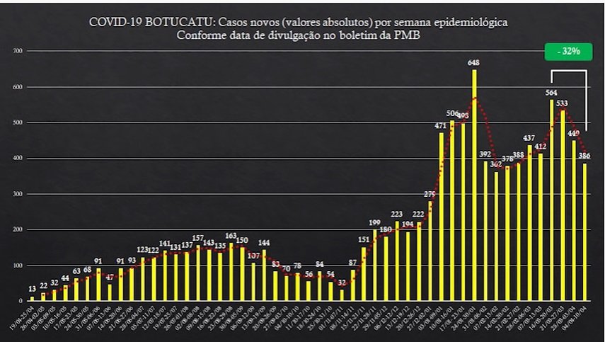A análise compreende três semanas epidemiológicas concomitantes com a adoção de medidas mais restritivas à circulação de pessoas e funcionamento de atividades econômicas. De 14 a 20 de março ocorreram 564 novas infecções pela Covid-19, número que teve redução no período seguinte, entre 21 e 27 de março, onde Botucatu contabilizou 533 infectados pela enfermidade. O decréscimo apontado foi de 5,49%.