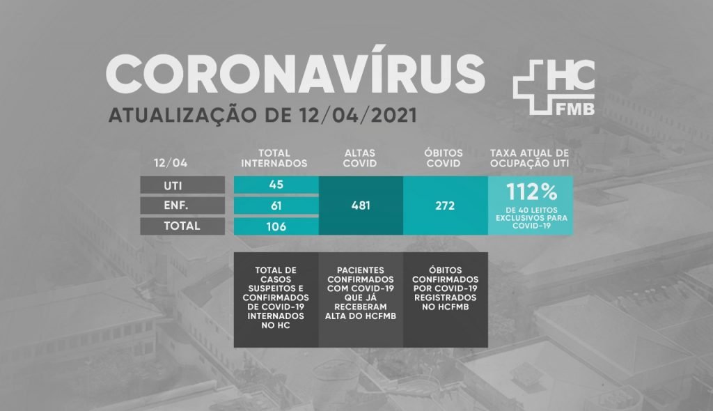 Nesta segunda-feira, 12 de abril, o Hospital das Clínicas de Botucatu (HCFMB) registrou quatro mortes em decorrência da Covid-19. São 272 óbitos ocorridos desde o início da pandemia, há um ano.