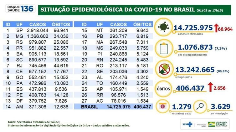 Covid-19: Brasil tem 406,4 mil mortes e 14,7 milhões de casos