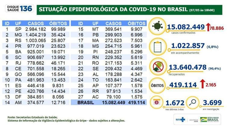 Já o número de casos acumulados foi para 15.082.449. Nas últimas 24 horas, foram confirmados 78.886 novos diagnósticos positivos. Ontem, o sistema de informações do Ministério da Saúde estava em 14.930.183.