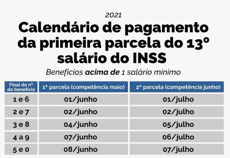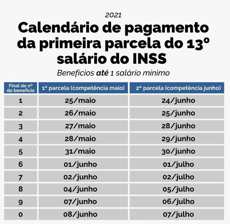 Antecipada para maio por causa da pandemia de covid-19, a primeira parcela do décimo terceiro do Instituto Nacional de Seguro Social (INSS) começará a ser paga no próximo dia 25. Os depósitos ocorrerão até 8 de junho.